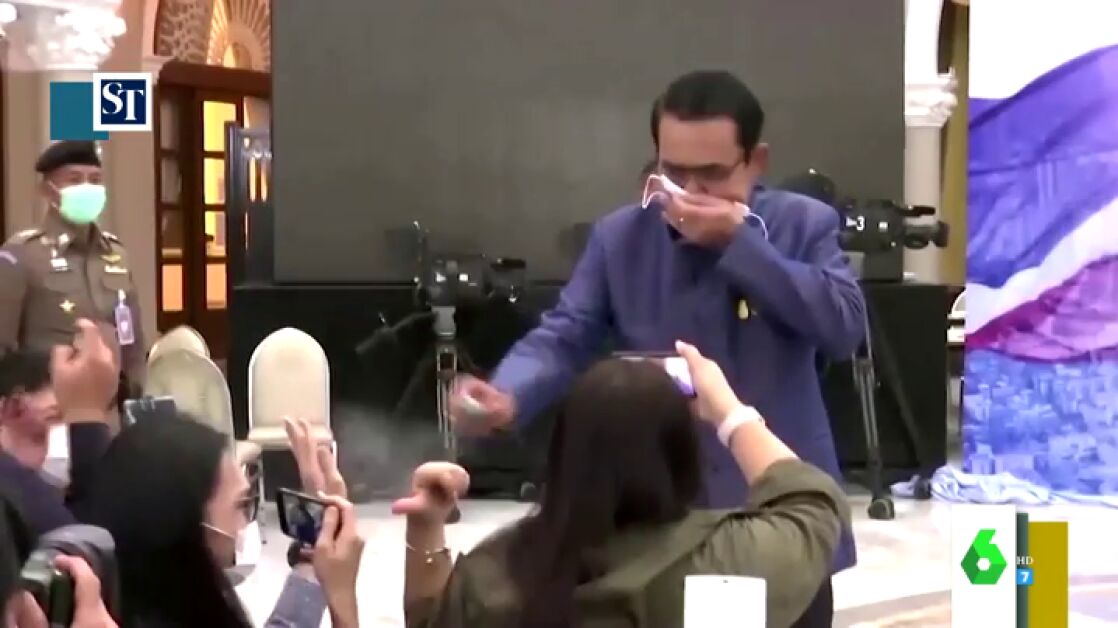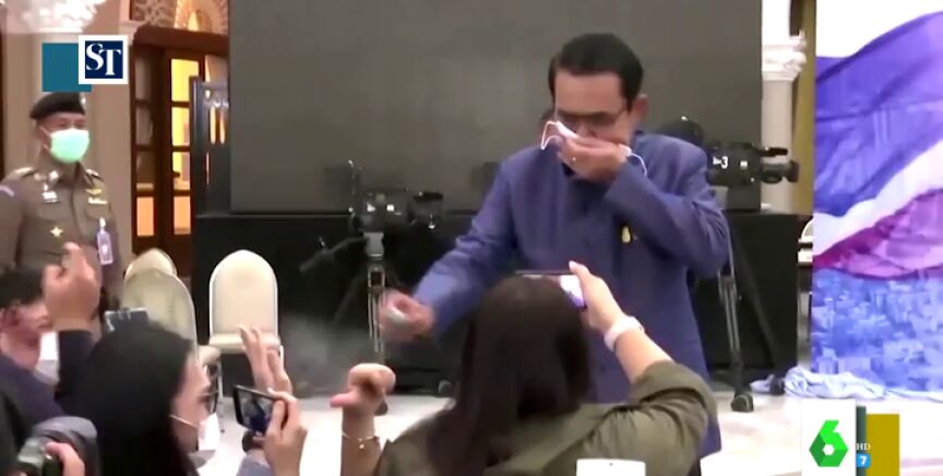 El primer ministro de Tailandia rocía con gel hidroalcohólico a los periodistas