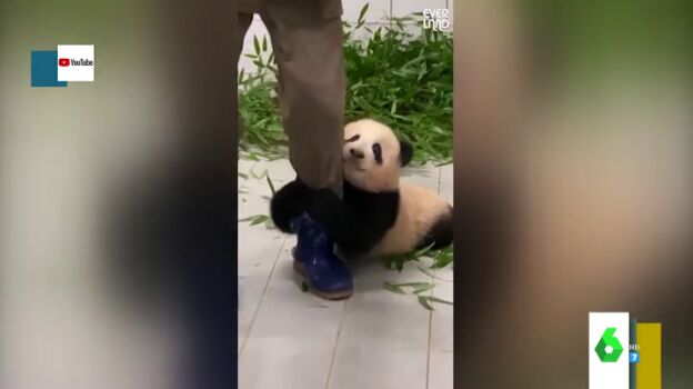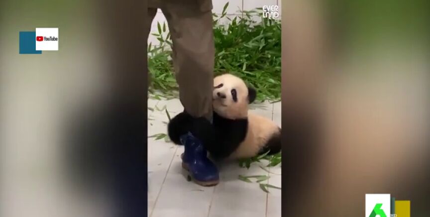 Se trata de Fu Bao, nacido hace unos meses, que se ha encariñado tanto de su cuidador que cuando le intenta dejar en el suelo, el oso panda agarra su pierna con mucha fuerza. "¡Qué gracioso!", destaca Lorena Castell sobre este viral que puedes ver al completo en el vídeo principal de esta noticia.