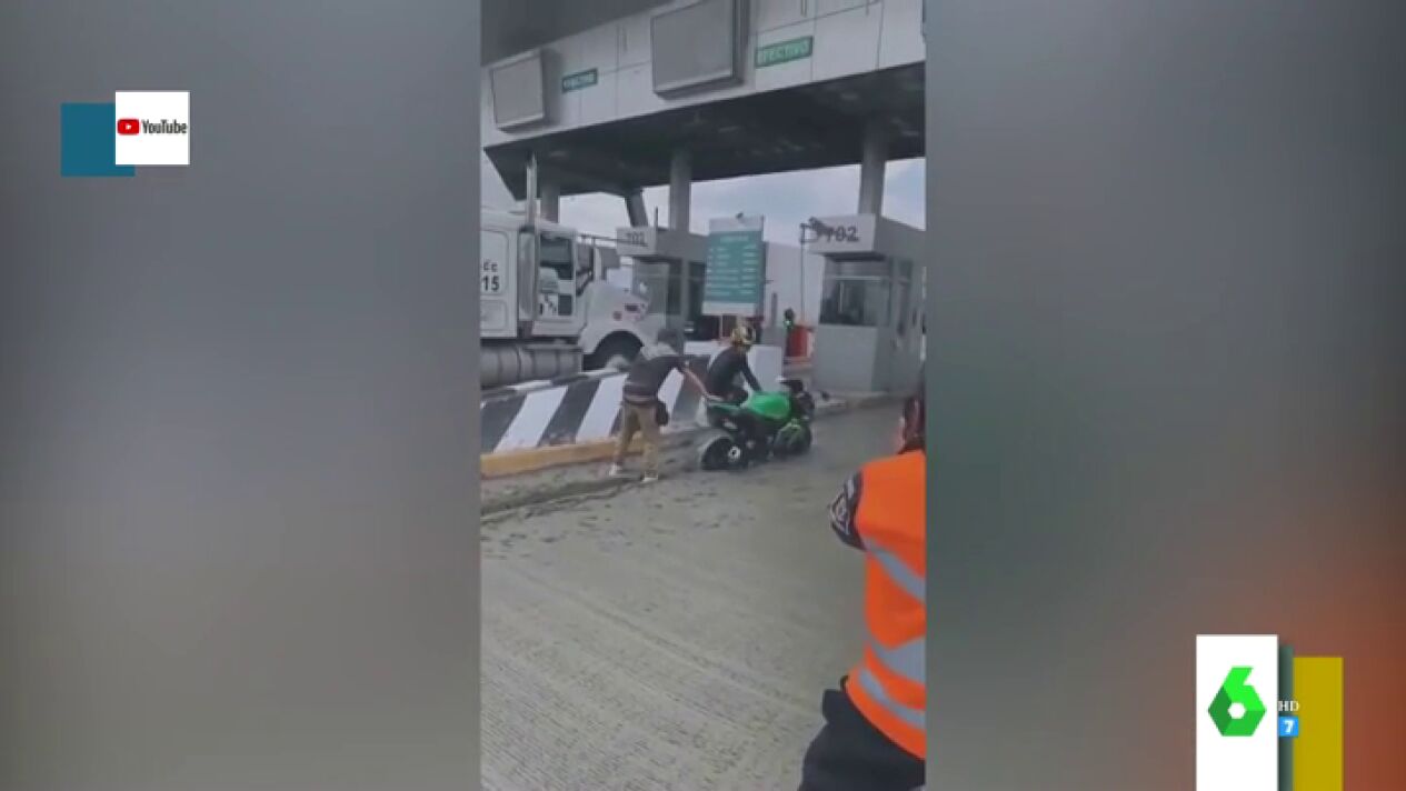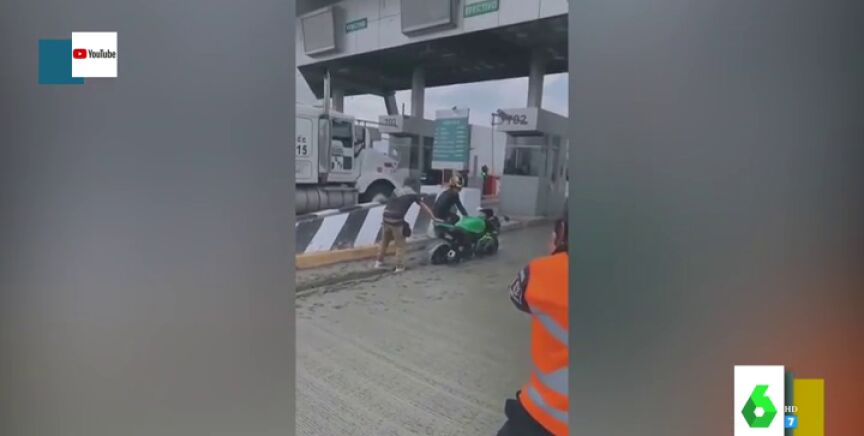 En este vídeo de Zapeando se puede ver cómo un joven queda atrapado con su moto tras intentar saltarse sin pagar un peaje que estaba en obras.