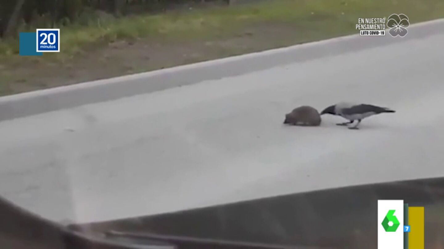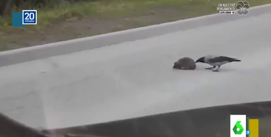 La zapeadora muestra en el programa el tierno vídeo de un pájaro que ayuda a un erizo a cruzar rápido la carretera para evitar que muera atropellado.