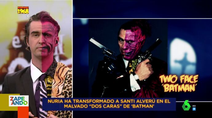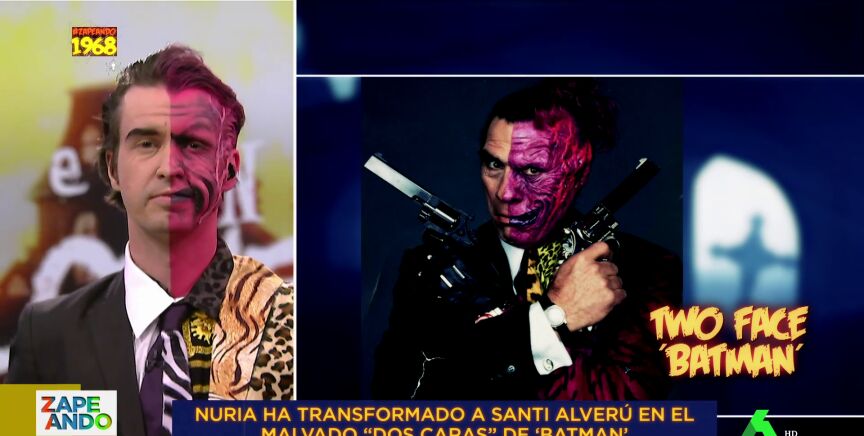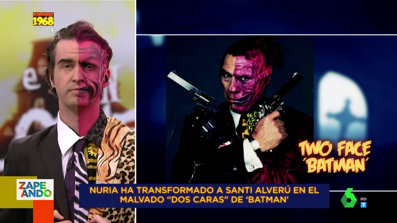 La maquilladora Nuria Adraos ha vuelto este viernes al plató Zapeando, esta vez con motivo de la celebración de Halloween, para transformar en directo a Santi Alverú en el malvado 'Dos caras' de la película Batman. Adraos ha vuelto a aceptar un reto del programa y ha convertido en tiempo récord a Alverú en el enemigo de Batman gracias al maquillaje.