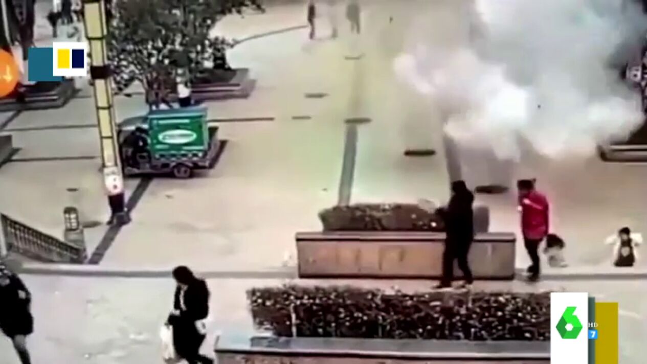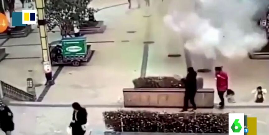 En este vídeo se puede ver el susto sufrido por varios viandantes en China cuando, de repente, las alcantarillas salen volando, tras lanzar un niño un petardo dentro de una de ellas.