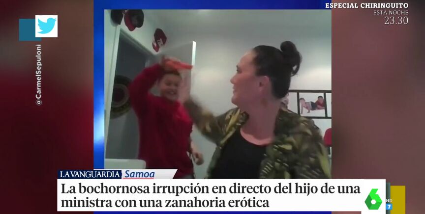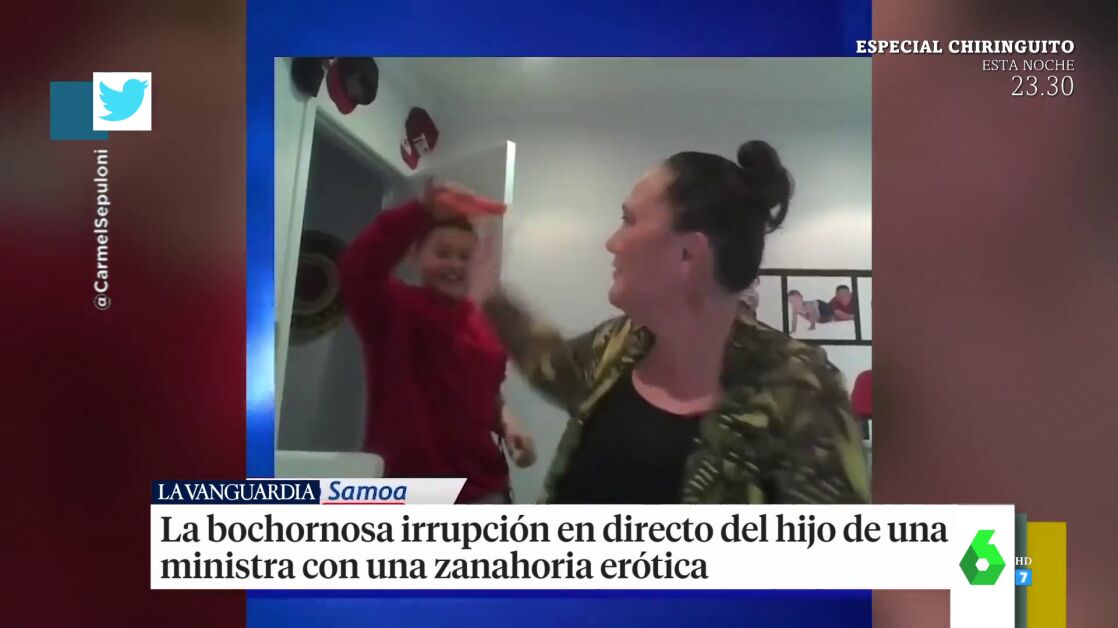 Durante la pandemia hemos visto numerosos casos de hijos que trolean a sus padres durante videollamadas de trabajo. Eso es precisamente lo que hizo el vástago de una ministra neozelandesa, Carmel Sepuloni, que irrumpió en directo durante una entrevista de su madre, riendo y agitando una zanahoria cuya forma le recordaba a un pene.