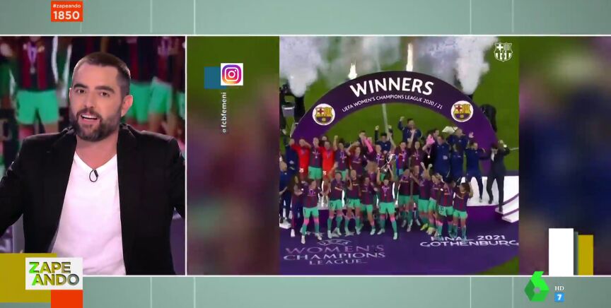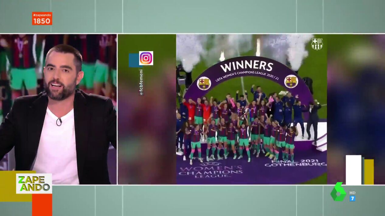 Dani Mateo destaca en directo en Zapeando al equipo femenino del Fútbol Club Barcelona tras conquistar su primera Champions frente al Chelsea. "Qué guerreras, qué barbaridad", afirma el presentador, que cuenta cómo "arrasaron 0-4" frente al equipo inglés.