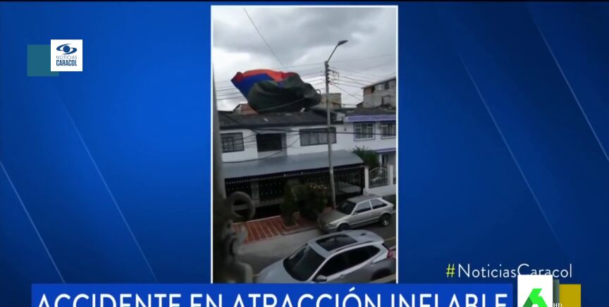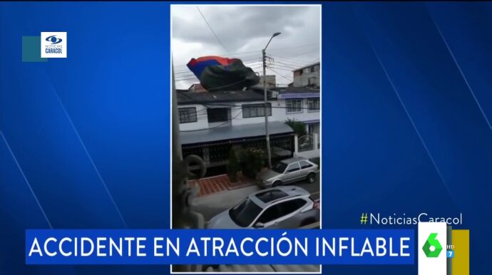 Un castillo hinchable ha salido volando por culpa del viento mientras cinco niños saltaban encima. Los hechos han ocurrido en Bogotá, Colombia. La atracción llegó a posicionarse sobre el tejado de un edificio, y de hecho, una de las niñas acabó en la superficie.
