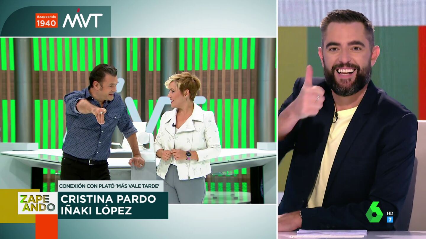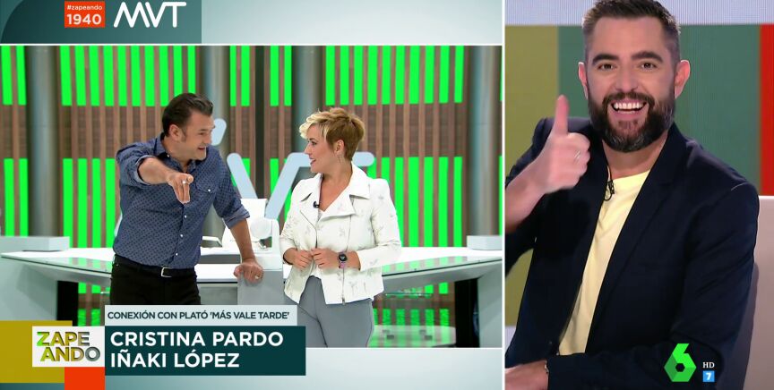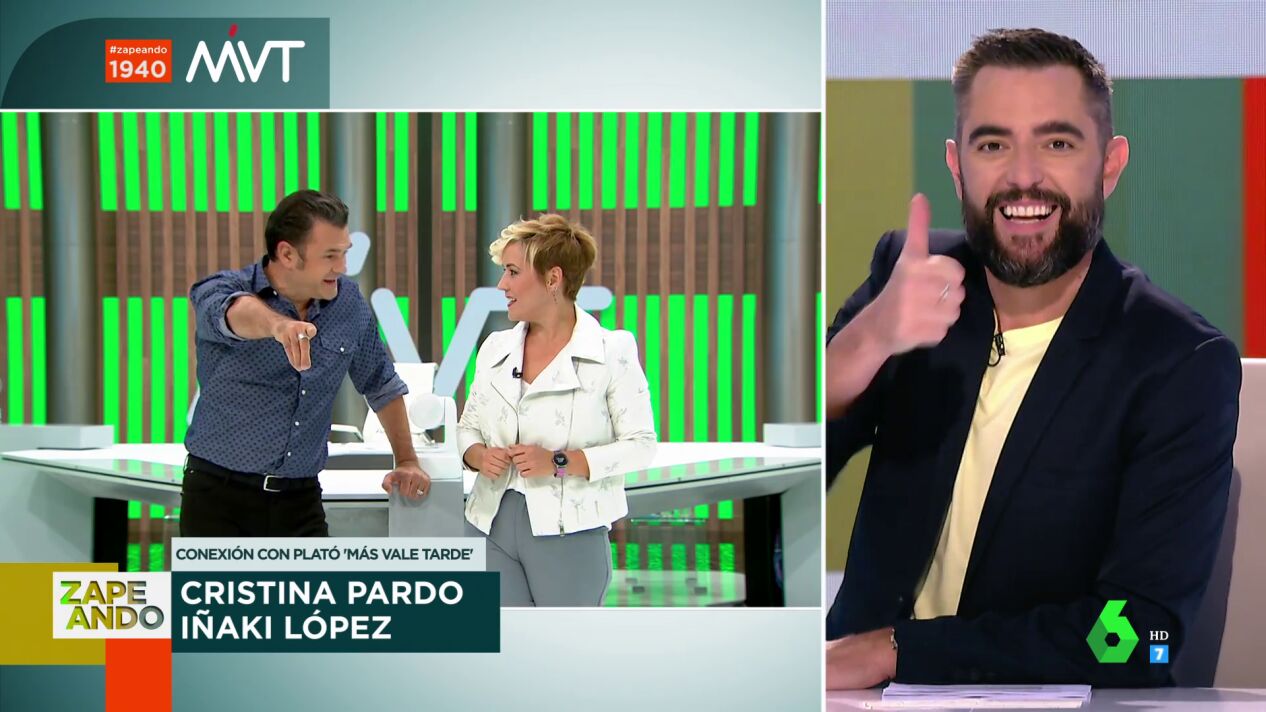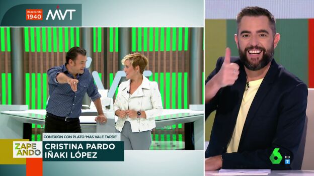 Antes de terminar Zapeando, Dani Mateo conecta con el plató de Más Vale Tarde, donde charla con sus presentadores, Cristina Pardo e Iñaki López. El presentador vasco confiesa que ha ido a ver a Dani Mateo al teatro.