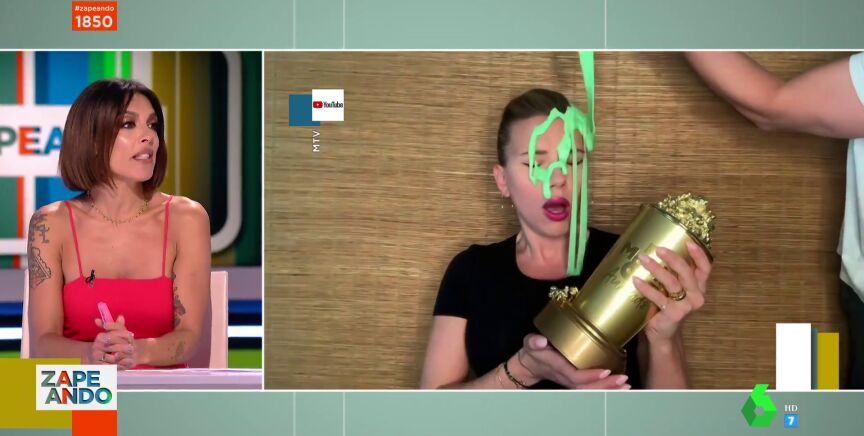 "¿Qué coño haces?", le preguntó la joven cuando el guionista le tiró un líquido verde por encima. "Qué bonitas son las cosas cuando son naturales e improvisadas", ironiza Quique Peinado al ver la escena. Por su parte, Lorena Castell no puede evitar su sorpresa al descubrir quién es el marido de Johansson: "No me gusta, no lo había visto, no sabía que se había casado". Puedes ver el análisis completo de los zapeadores en el vídeo de esta noticia.