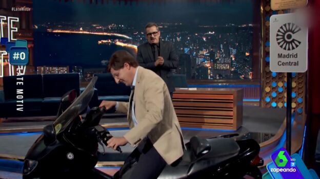 José Luis Martínez-Almeida irrumpe en moto en el plató de 'Late Motiv' para sorprender a Buenafuente
