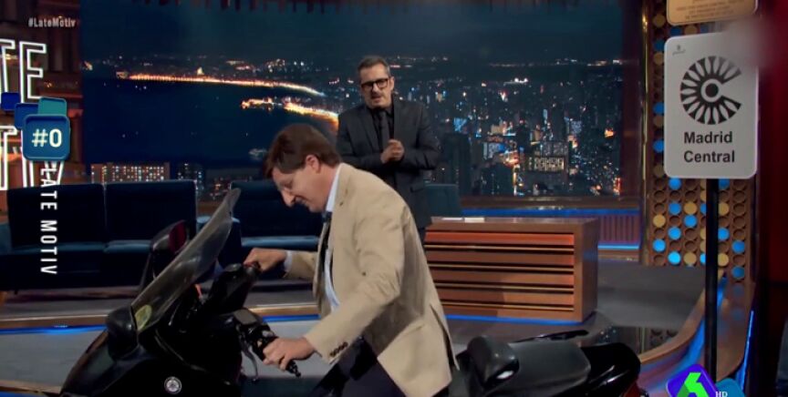 El cómico Raúl Pérez visitó el plató de 'Late Motiv' convertido en José Luis Martínez-Almeida. El 'alcalde de Madrid' sorprendió a Andreu Buenafuente conduciendo una motocicleta.