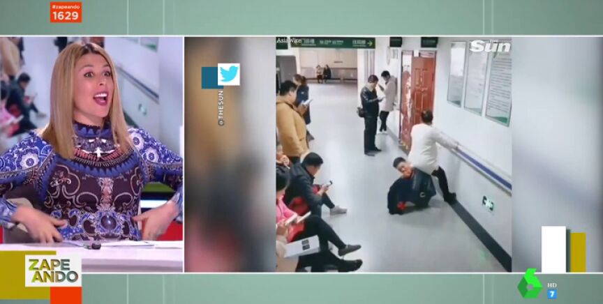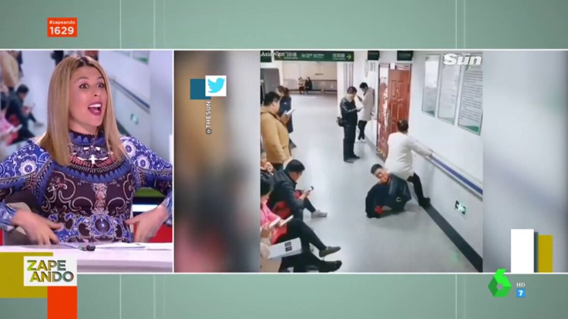 Anna Simon presenta en Zapeando "al mejor marido del mundo", un hombre que se 'convierte' en silla al sentarse en el suelo para que su mujer, embarazada, pueda sentarse encima mientras espera al médico en el hospital.