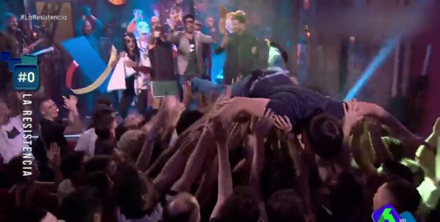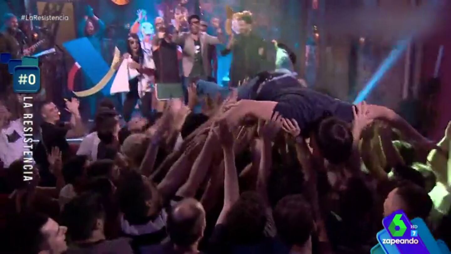 Tras decir entre susurros Ricardo Castella "le sale a pagar", comienza se desata la locura en el plató y se monta un fiestón que empieza con gente que sale al escenario gritando y bailando y acaba con el joven malagueño por los aires, sujetado por el público de 'La Resistencia'.