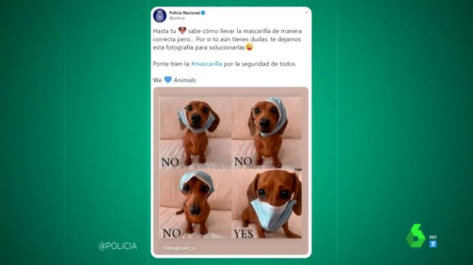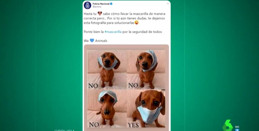 En las imágenes se puede ver a un perro llevando la mascarilla en diferentes posiciones. Desde usarla como un sombrero a ponerla debajo de la barbilla. "Ponte bien la mascarilla por la seguridad de todos", afirman los agentes, que terminan el mensaje junto a un corazón y el siguiente texto: "Nosotros queremos a los animales".