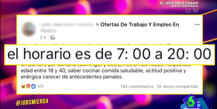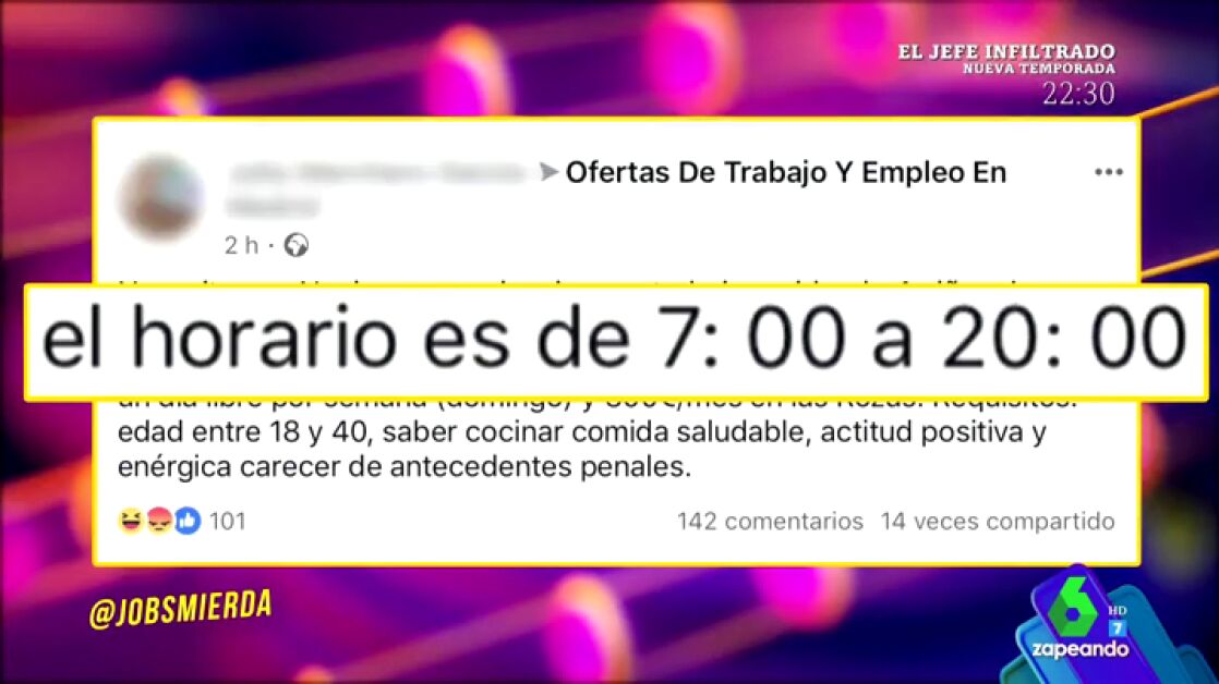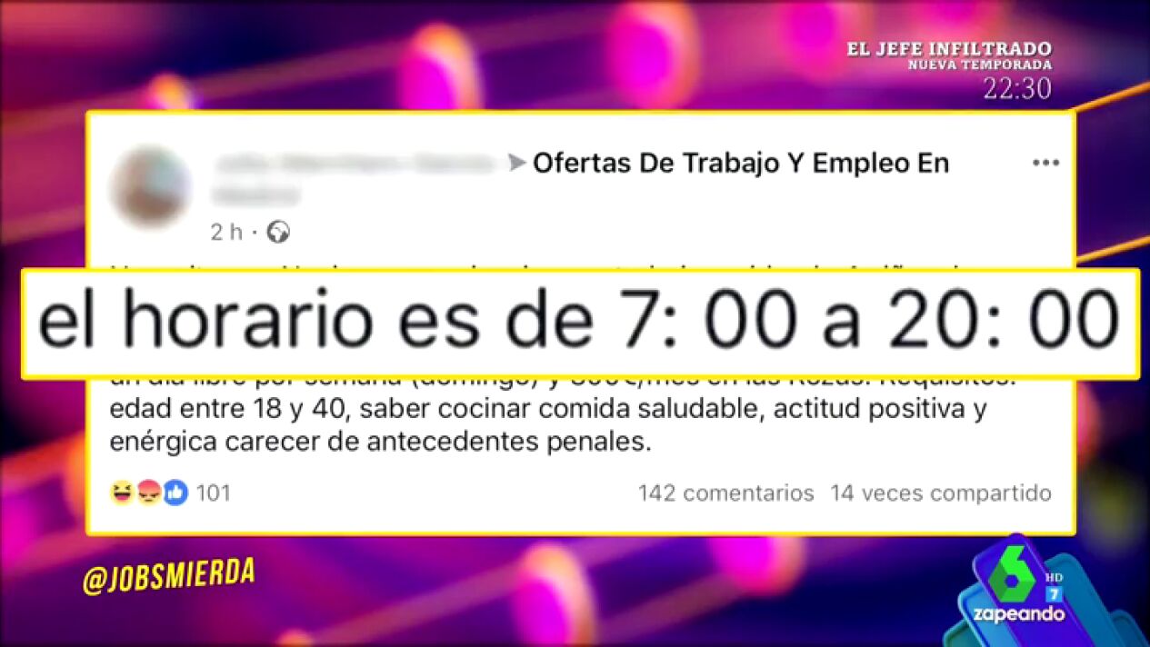 Quique Peinado se suma a esta crítica enumerando las indignantes ofertas de trabajo que se pueden ver en Internet: desde empleos no remunerados hasta horarios de 13 horas diarias.