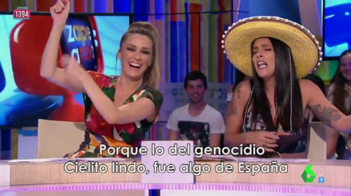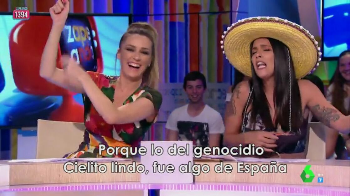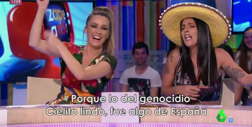 Con la ayuda de Anna Simon, que no ha dudado en marcarle el ritmo, la zapeadora ha creado un auténtico hit musical: "Amigos mexicanos, no fue muy lindo lo que os hicieron. Esos españolazos una somanta a palos os dieron. Ay, ay, ay, ay, ¡Qué alimañanas! porque lo del genocidio, cielito lindo, fue algo de España".