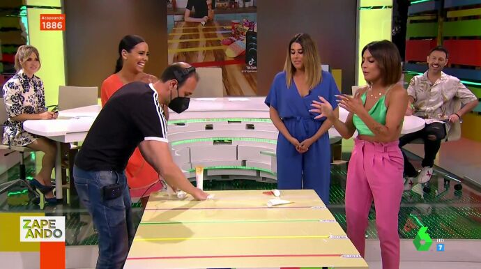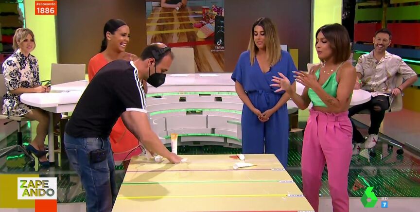 "Estoy emocionada porque es la primera vez que estoy aquí pero no participo", explica Lorena Castell cuando ha intentado sumarse al reto de los zapeadores entre los gritos del plató: "¡No!".