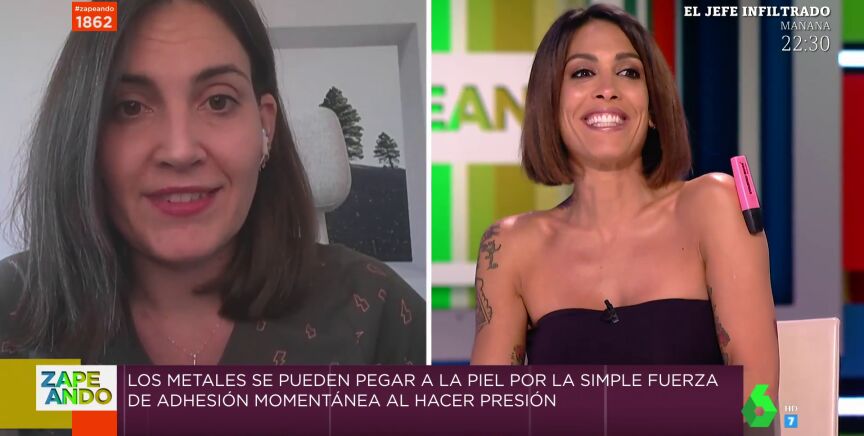 Boticaria García ha desmentido en Zapeando un bulo que sostiene que las vacunas son magnéticas, mostrando que, como nuestra piel tiene grasa, es posible pegarse objetos a ella, y no solo metales, sin estar vacunados. Algo que también han puesto en práctica los zapeadores en el plató, como Lorena Castell, que ha sorprendido con su habilidad para pegarse al cuerpo una cuchara, un subrayador...