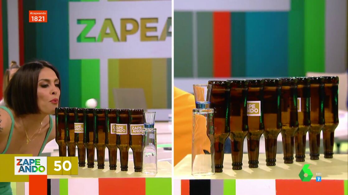 Dani Mateo somete a Lorena Castell y Miki Nadal al último reto viral. Primero, los zapeadores deben hacer un caminito de botellas y poner vasos al final, tras ello, deben soplar las pelotas de ping pong hasta meterla en esos vasos. Para todo ello tiene un minuto.