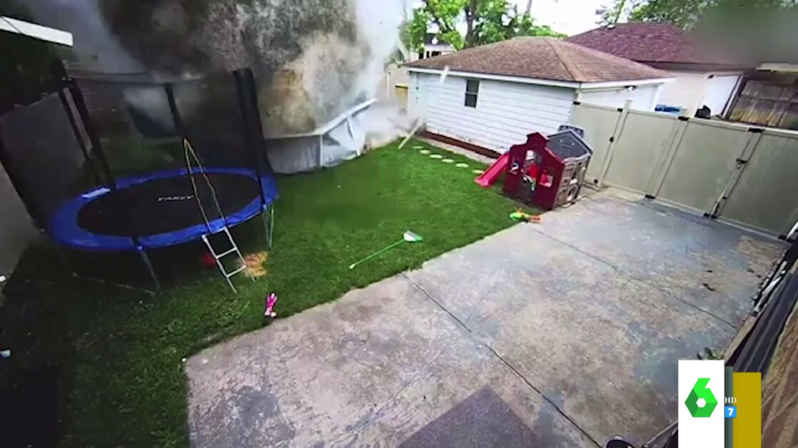 La conductora que protagoniza este vídeo irrumpió con el coche en el patio de una casa, atravesando la valla del jardín a toda velocidad y llevándose por delante una cama elástica e incluso una piscina llena de agua.