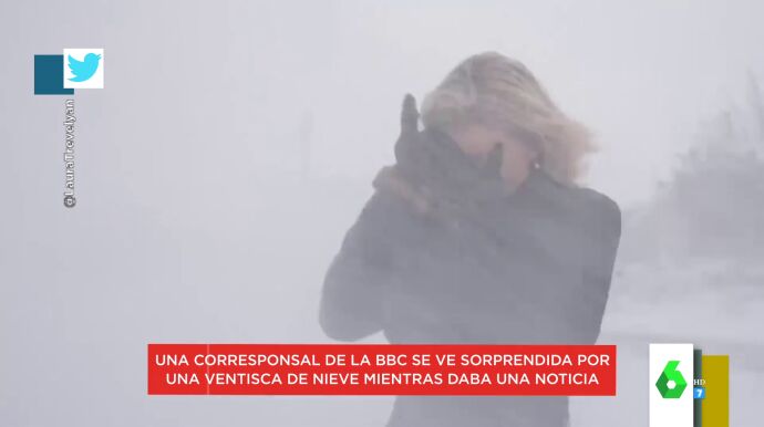 La periodista de la BBC Laura Trevelyan estaba informando cuando fue "atacada" por una tormenta de nieve.