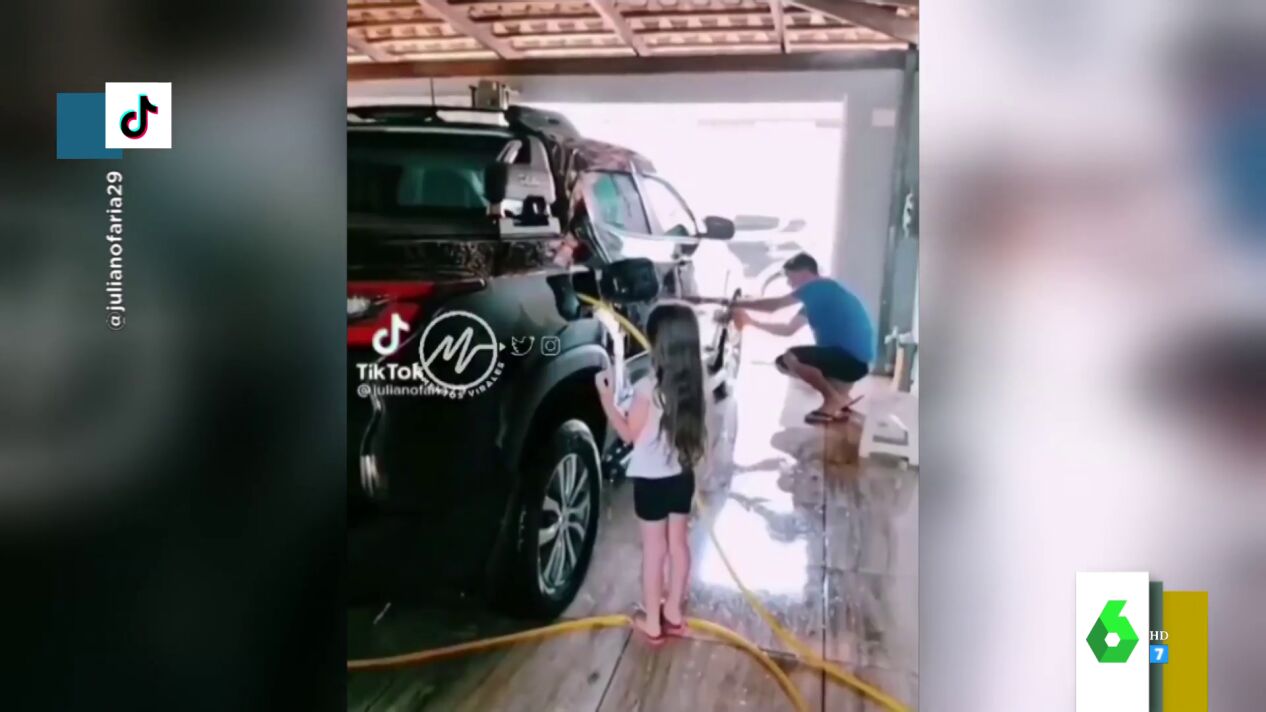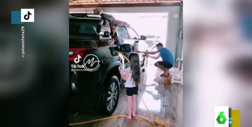 El momento en el que una niña 'ayuda' a su padre a lavar el coche metiendo la manguera en el depósito de gasolina