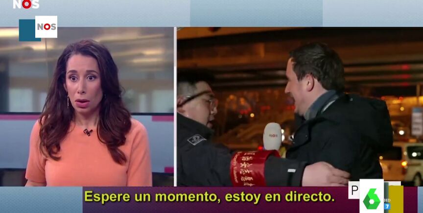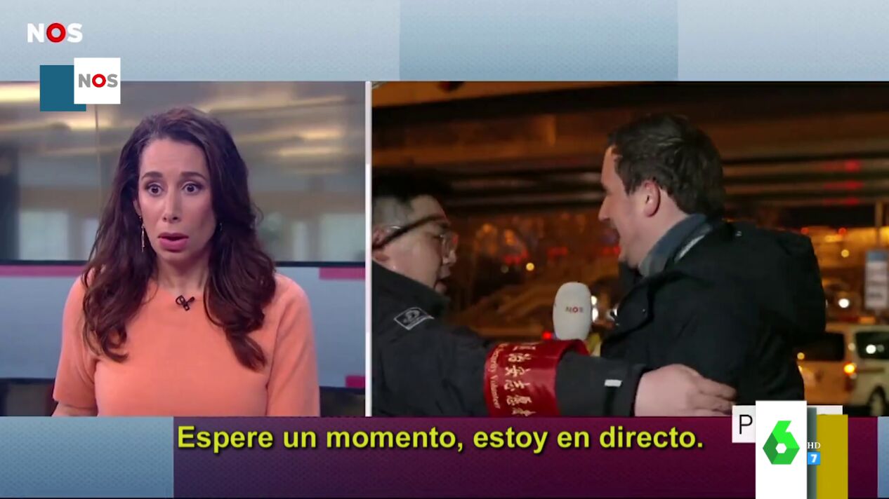 Lorena Castell enseña el complicado momento que sufrió un reportero en mitad de una conexión. La cadena holandesa 'Nos' contacta con el corresponsal en directo, cuando éste es interrumpido por la Policía. El corresponsal se encuentra en China y un agente de Policía le empieza a echar del sitio donde se encuentra, diciéndole que ahí no se puede grabar y que se tiene que mover.