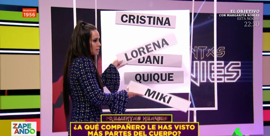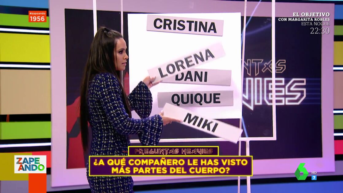 La zapeadora de Vallecas tiene claro cuál es al que menos le ha visto: a Quique Peinado. Pero, ¿y al que más? Pedroche realiza en el vídeo principal de esta noticia varias confesiones como que le ha visto "el chichi" a Lorena Castell mientras que a Miki Nadal no le "ha visto su cola", algo que provoca un cómico debate en plató.