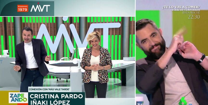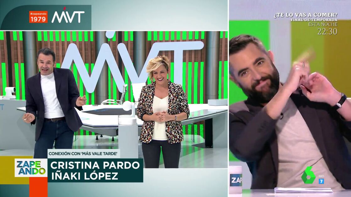 "¿Programas de humor hay en laSexta?", vacila Iñaki López a Dani Mateo, que le contesta con una peineta. Además, el presentador vasco no puede evitar bailar en plena conexión en directo. Puedes verlo en este vídeo.