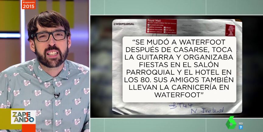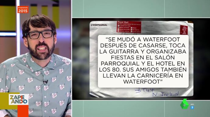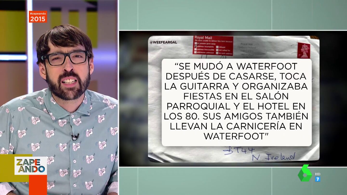 "Si queréis escribir a alguien y no sabéis su dirección, ojo a esto", afirma Quique Peinado en el plató de Zapeando, donde muestra la carta viral de unos amigos aun irlandés que solo tenían su nombre y el pueblo en el que creció.