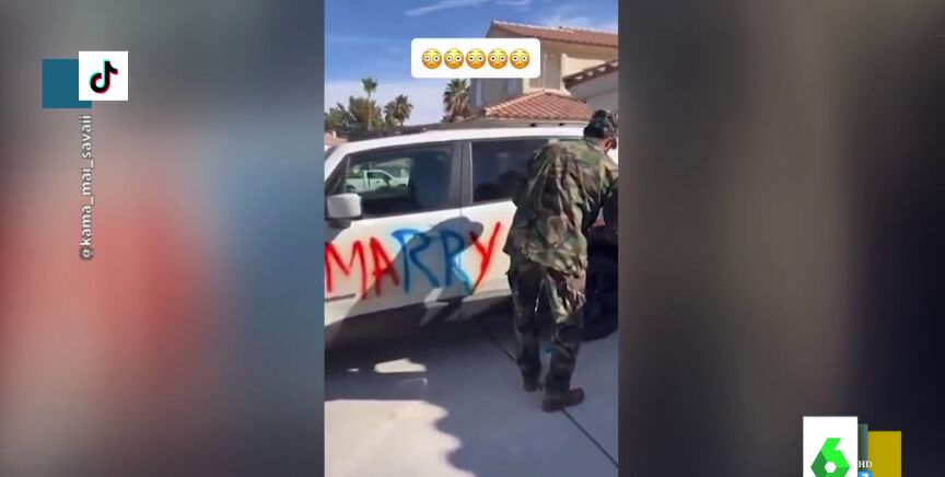 Hemos visto de todo en lo que a pedidas de mano se refiere. Pero siempre hay una que nos sorprende un poco más. Y es que un militar americano decidió pedirle matrimonio a su novia pintándole su declaración de amor en el coche blanco de esta con spray. "Ninguna mujer podría resistirse a una petición así, ¿no? Pues esperad a ver la de la novia..", ha comentado Cristina Pedroche justo antes de dar paso a las imágenes en las que se ve la reacción de la mujer, a quien parece que no le hizo mucha gracia lo de que pintara su vehículo.