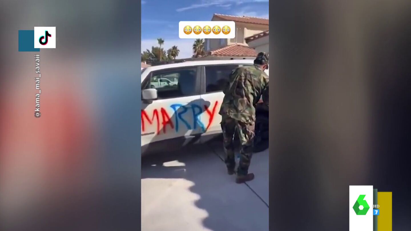 Un militar americano quiso dar una sorpresa a su novia pintándole "¿Quieres casarte conmigo?" con spray. La reacción de la pareja, a quien parece que no le encantó la propuesta, en este vídeo.