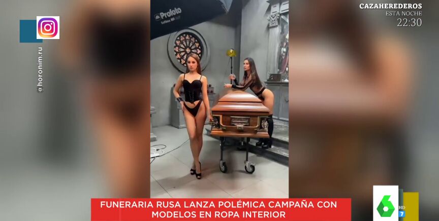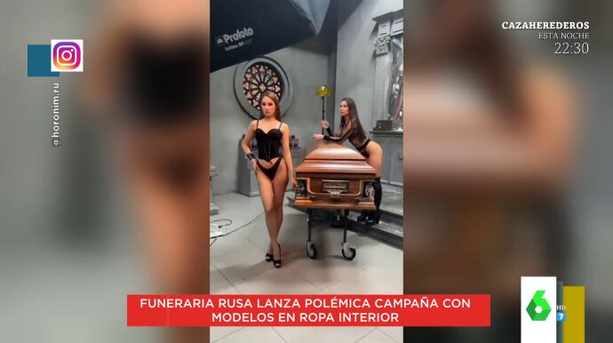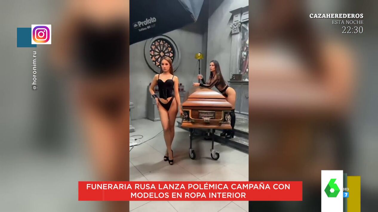 Marta Torné enseña en Zapeando la polémica campaña realizada por una funeraria rusa que utiliza a modelos en ropa interior posando junto a los ataúdes. Las modelos posan en lencería como reclamo publicitario. Eso sí, para Lorena Castell "el ataúd es bastante tétrico".