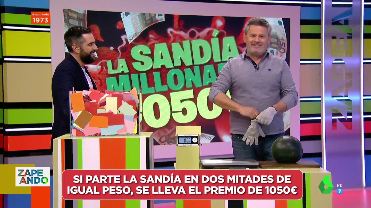 Zapeando sigue repartiendo dinero con la sandía millonaria. En el programa de hoy, la afortunada ha sido Ángeles, que ha solicitado que sea Miki Nadal el que parta la codiciada fruta para conseguir 1.050 euros.