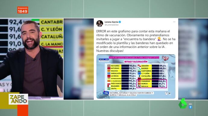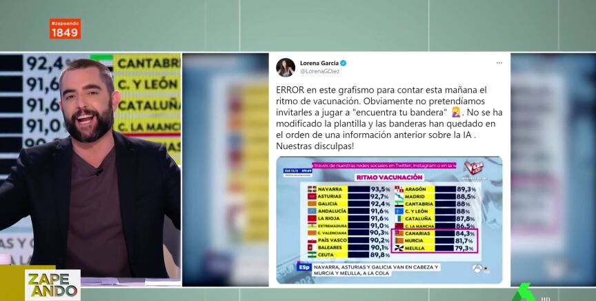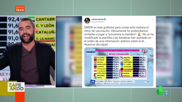 "Ayer durante unos segundos Espejo Público parecía Zapeando, no porque pusieran vídeos de perros todo el rato, sino porque la cagaron", ha afirmado Quique Peinado, tras lo que ha contado que "hablaban sobre el ritmo de vacunación en las CCAA, cuando apareció una tabla de datos en la que ninguna bandera estaba donde tenía que estar".