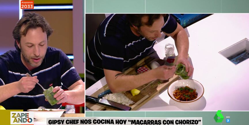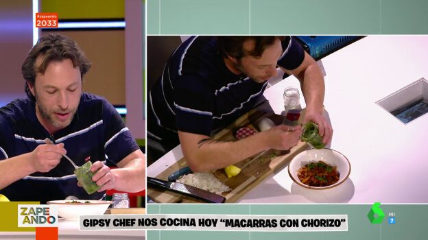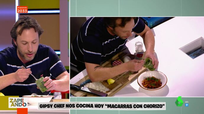 Gipsy Chef trae al plató de Zapeando una reinvención de los macarrones con chorizo bautizada como "macarras con chorizo". Una receta para economizar en limpieza, tiempo y electricidad, según explica el cocinero, que emplea ajo, cebolla y chorizo en esta elaboración, así como un poco de aceite.