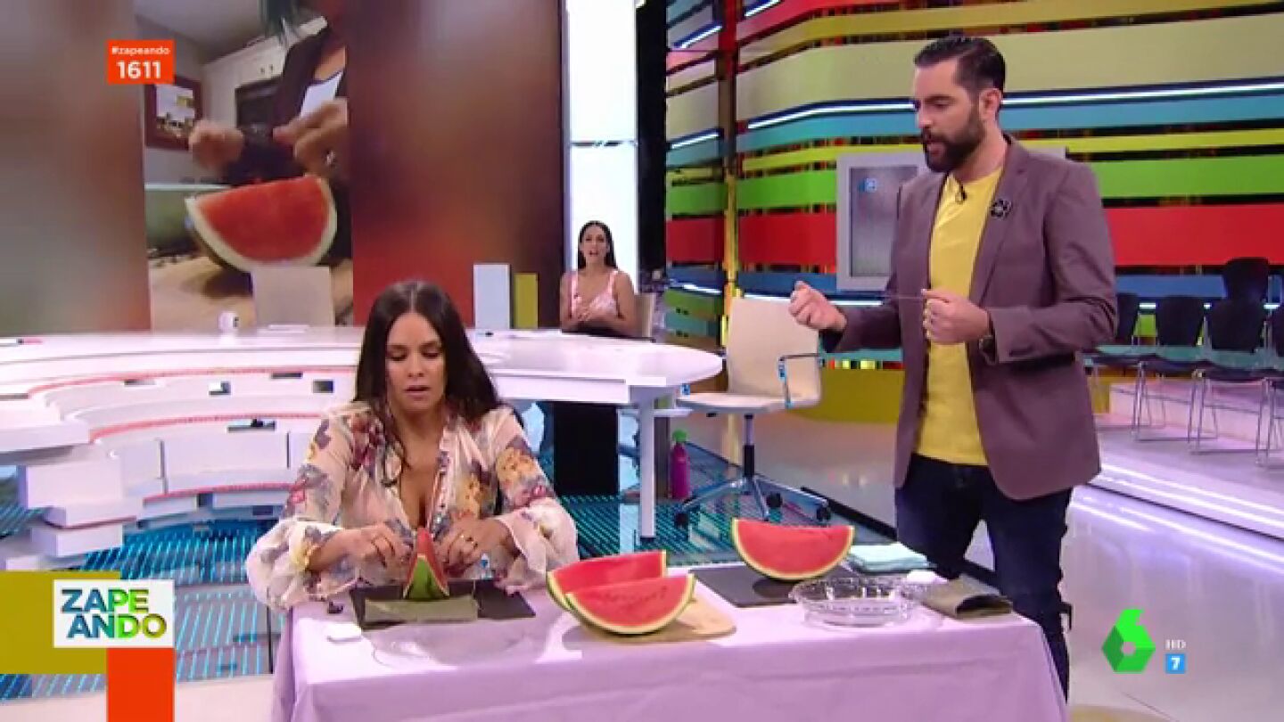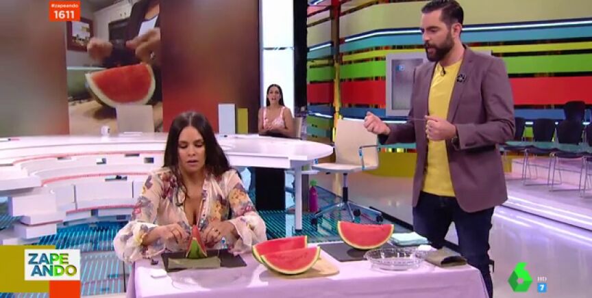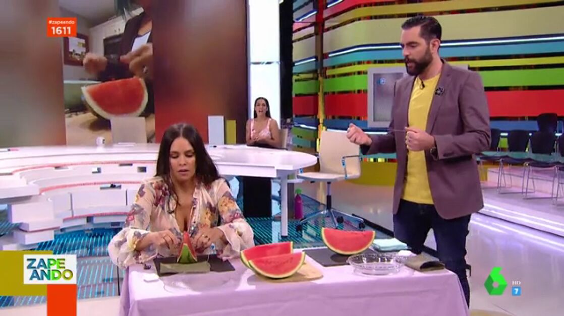 Cristina Pedroche y Dani Mateo comprueban si este truco viral funciona realmente en el plató de Zapeando. ¿Serán capaces de cortar la sandía a la perfección con hilo dental?