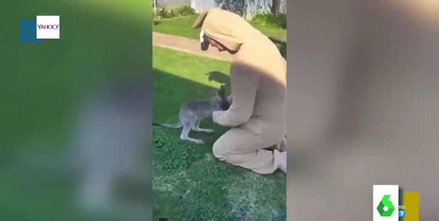 Y es que, aunque parezca mentira, el pequeño canguro se acerca al joven, parece creer que se trata de su madre y llega a introducirse en la bolsa marsupial del disfraz -donde los canguros transportan a sus crías-. Puedes ver el momento en este vídeo.