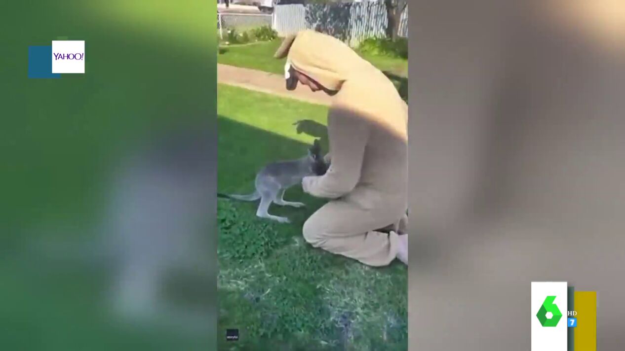 La sorprendente reacción de una cría de canguro al ver a un joven disfrazado de canguro