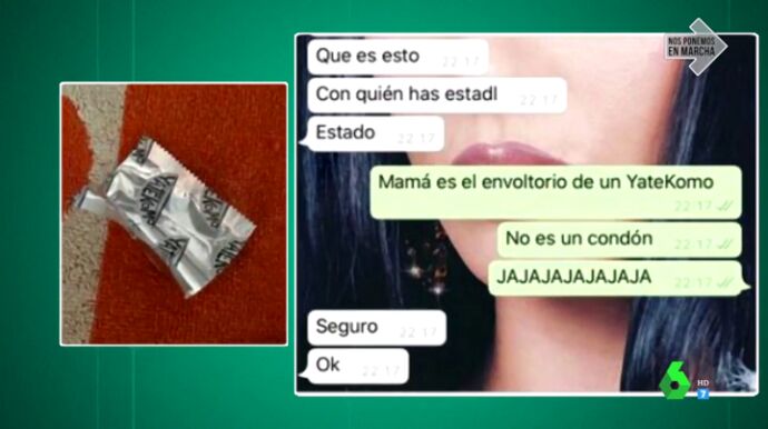 Dani Mateo muestra la surrealista charla de una madre con su hijo en WhatsApp. Después de que el joven le mande una fotografía de un envoltorio, la mujer piensa que es un condón, originando un divertido momento.