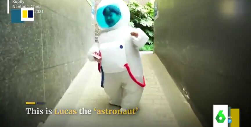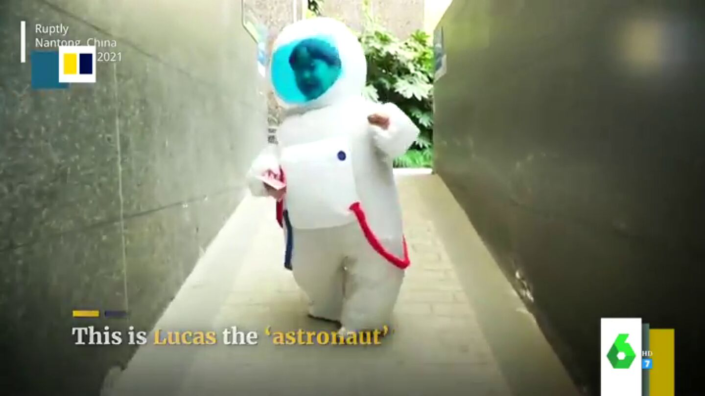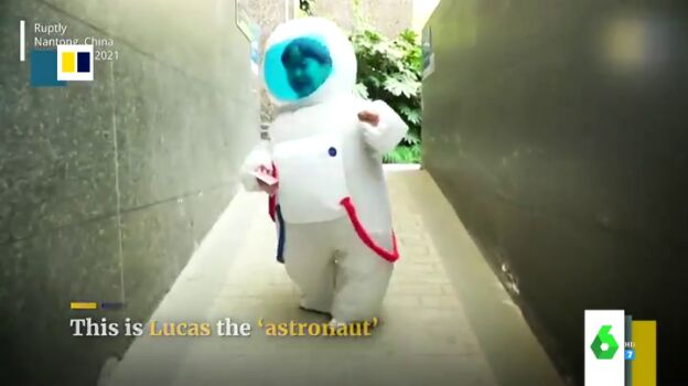 Y es que el pequeño sale de su casa cada día con un traje inflable de astronauta que, además de protegerle contra el COVID, le permite jugar como si estuviera en plena galaxia.