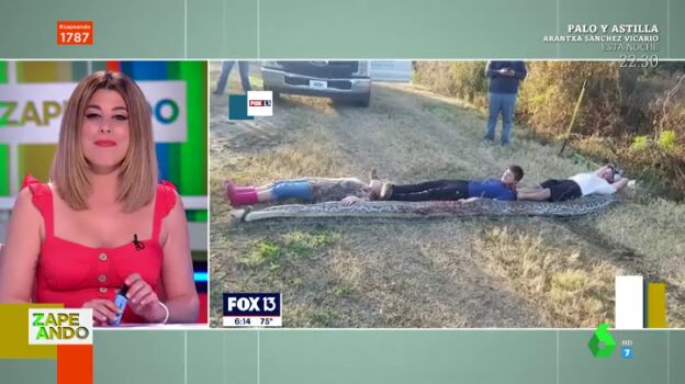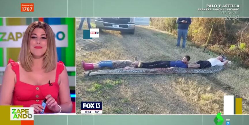 Para presumir del hallazgo, y una vez muerta, la familia se coloco tumbada a lo largo de la serpiente y dejar así constancia del impactante tamaño del animal. Dani Mateo tiene claro que si se encuentra unas así, no llama a la Policía: "Yo llamo a la inmobiliaria para mudarme ese mismo día".
