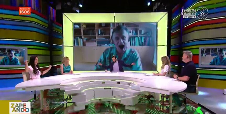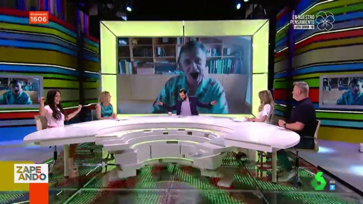 Anna Simon destaca a Dani Mateo que el programa tiene un regalo para él por su cumpleaños y es que Zapeando conecta en directo con El Gran Wyoming, quien aparece en pantalla por sorpresa cantándole el 'Happy Birthday' a lo Marilyn Monroe.
