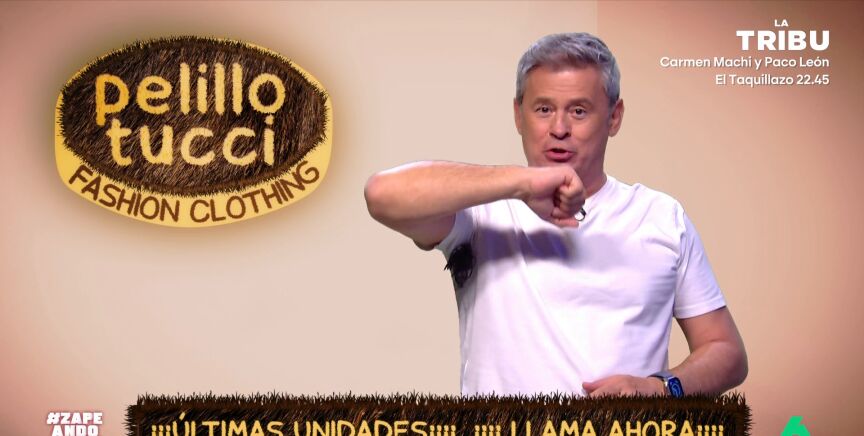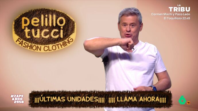 Como muestra el zapeador, en su colección se puede encontrar una camiseta que tiene pelo sintético en la zona de la axila y en la espalda simulando vello. Además, como señala Nadal, con las 1.000 primeras compras regalan unos calzoncillos "con hucha peluda". "'Pelillo Tucci', siéntete vello", concluye Miki.