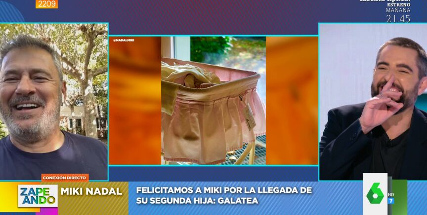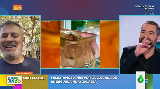 Miki Nadal y Helena Aldea han dado la bienvenida a Galatea, su primera hija en común, a primera hora de la mañana de este viernes 14 de octubre. Lo que supone que la familia de Zapeando cuenta ya con una espectadora más: "¡Vamos a felicitarle en directo como se merece!", sorprende Dani Mateo anunciando la presencia del colaborador de Zaragoza, que entra en directo por videollamada.