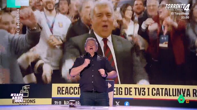 "Así es Laporta, nunca se sabe si está celebrando unas elecciones o una despedida de soltero", señala Virginia Riezu. Miki Nadal no duda en levantarse e imitar al presidente del Barça. "Ahí, ahí, giro", le guía Virginia.