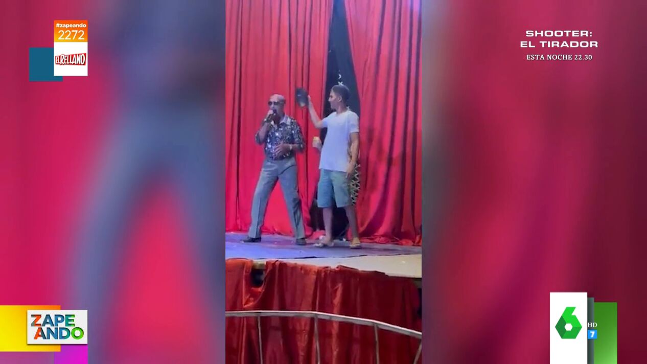 Miki Nadal muestra el viral de un espontáneo que se sube al escenario de un concierto y le quita el peluquín al cantante. Puedes ver la inesperada reacción del público, que va más allá de las risas, en este vídeo de Zapeando.