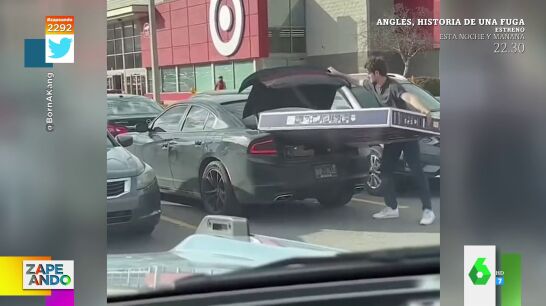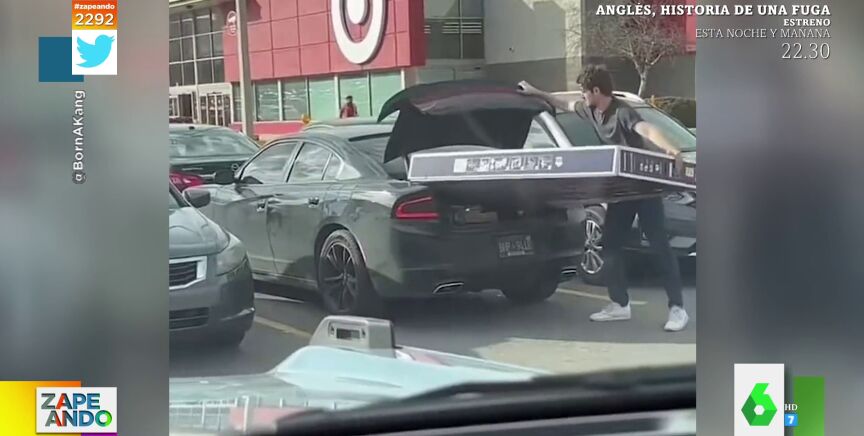 Pero al darse cuenta que tampoco entra en los asientos de atrás, finalmente decide colocarla sobre el maletero del coche: "O en América las teles cuestan muy baratas o este tío es rico, porque está claro que esa tele ahí no va a llegar a casa". "Yo creo que es tonto del culo", espeta Quique Peinado cortando las especulaciones de los zapeadores y provocando las risas en plató. Puedes ver la resolutiva manera que tiene este hombre de llevarse la tele a casa sobre este vídeo.