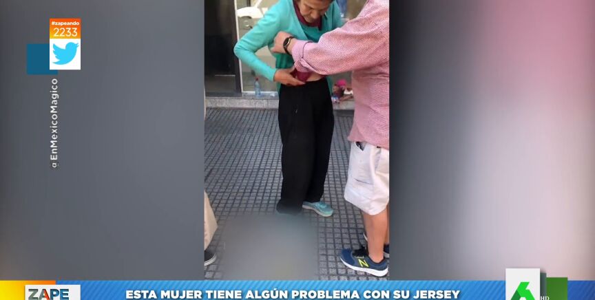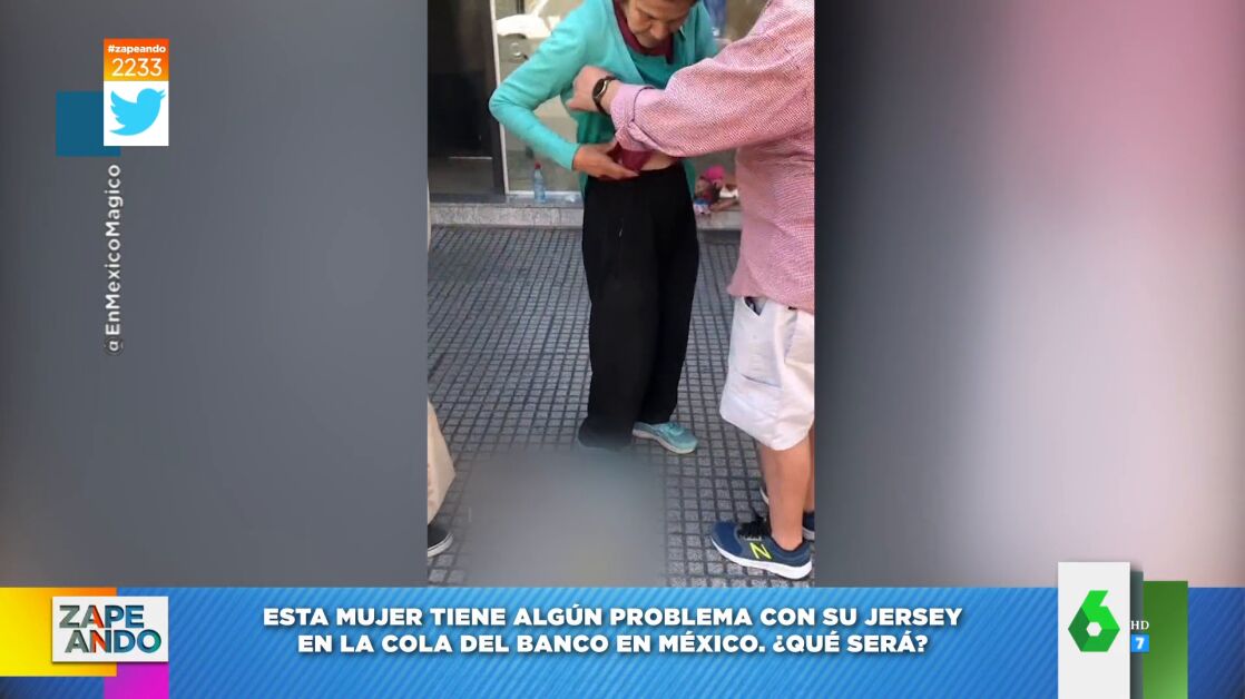 En México una mujer se encontraba haciendo cola para el banco, pero "la pobre tiene algún lío con el jersey y hasta su marido le tiene que ayudar", describe Valeria Ros la escena. Pero, ¿qué le ocurre? "Lo que sucede es que se le había metido dentro una rata", explica la humorista, que no puede evitar reaccionar a este vídeo viral diciendo: "¡Guau, una rata!".