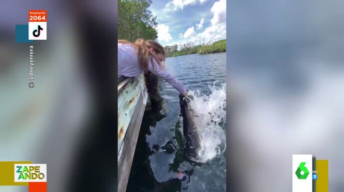 Miki Nadal muestra en Zapeando el momento en el que una joven está dando de comer salchichas a los peces cuando le sorprende "un monstruo de las profundidades". "Dar de comer a los peces ya puede ser considerado deporte de riesgo", sentencia el de Zaragoza ante estas impactantes imágenes.