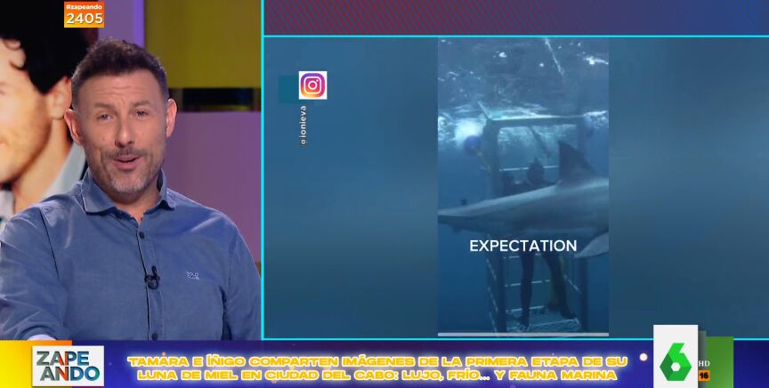 "Pero la realidad fue decepcionante", comenta el humorista, ya que "las orcas han disminuido el número de tiburones blancos en la zona y apenas han podido ver uno chiquitito y de refilón". Fue tan decepcionante que "Íñigo Onieva no se lo pasó tan bien como esperaba".