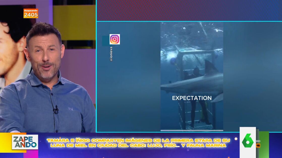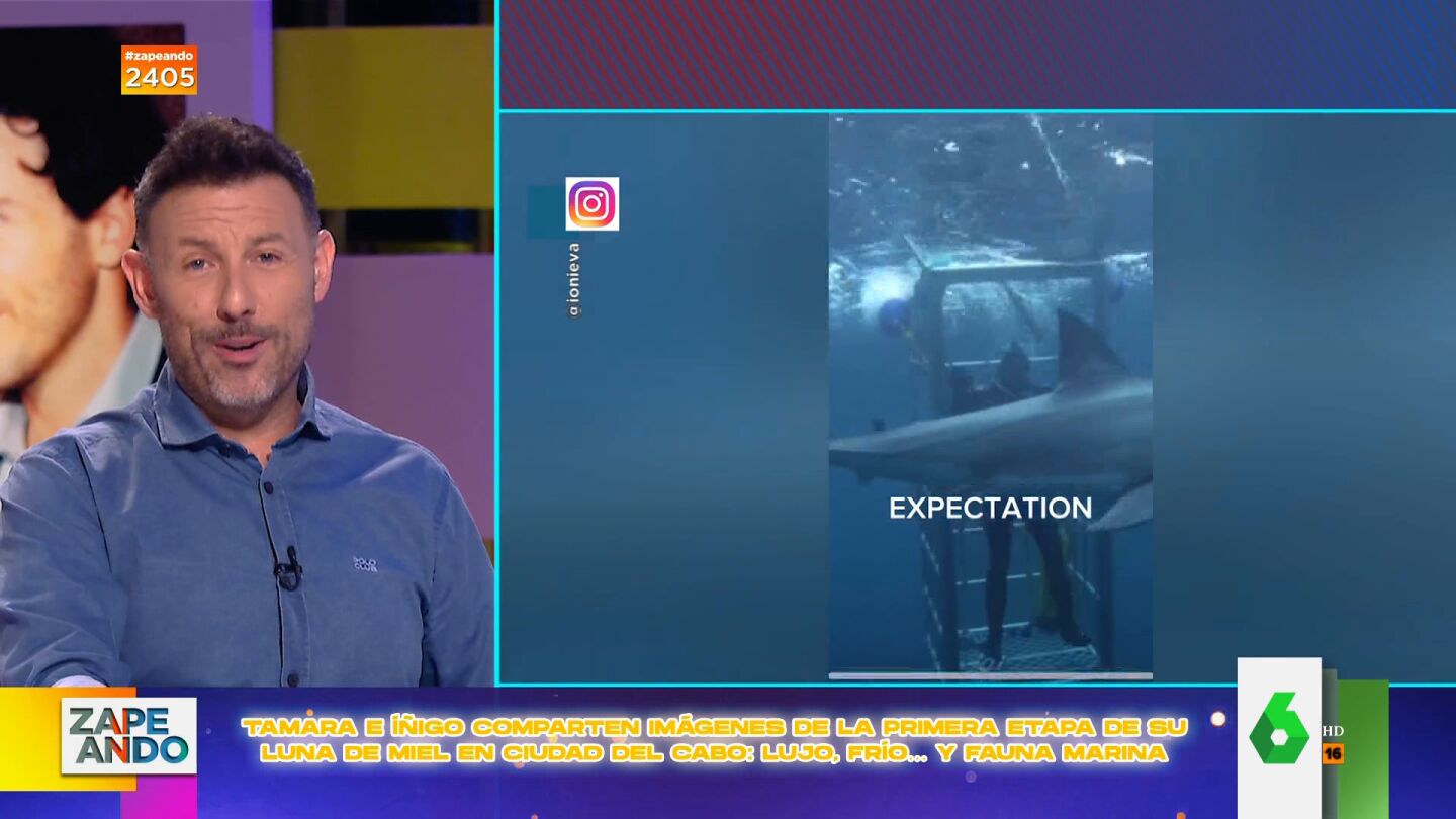 Tamara Falcó e Íñigo Onieva se van a recorrer el mundo por su luna de miel y la primera parada ha sido de Ciudad del Cabo, en Sudáfrica, donde han pasado unos días "disfrutando mucho de los lujos del hotel y de comidas gourmet, pero también han tomado riesgos porque han ido a nadar con tiburones", informa Iñaki Urrutia, a sus compañeros a los que muestra el momento en el que el empresario se sumerge en el mar para ver ejemplares de tiburones blanco en libertad.